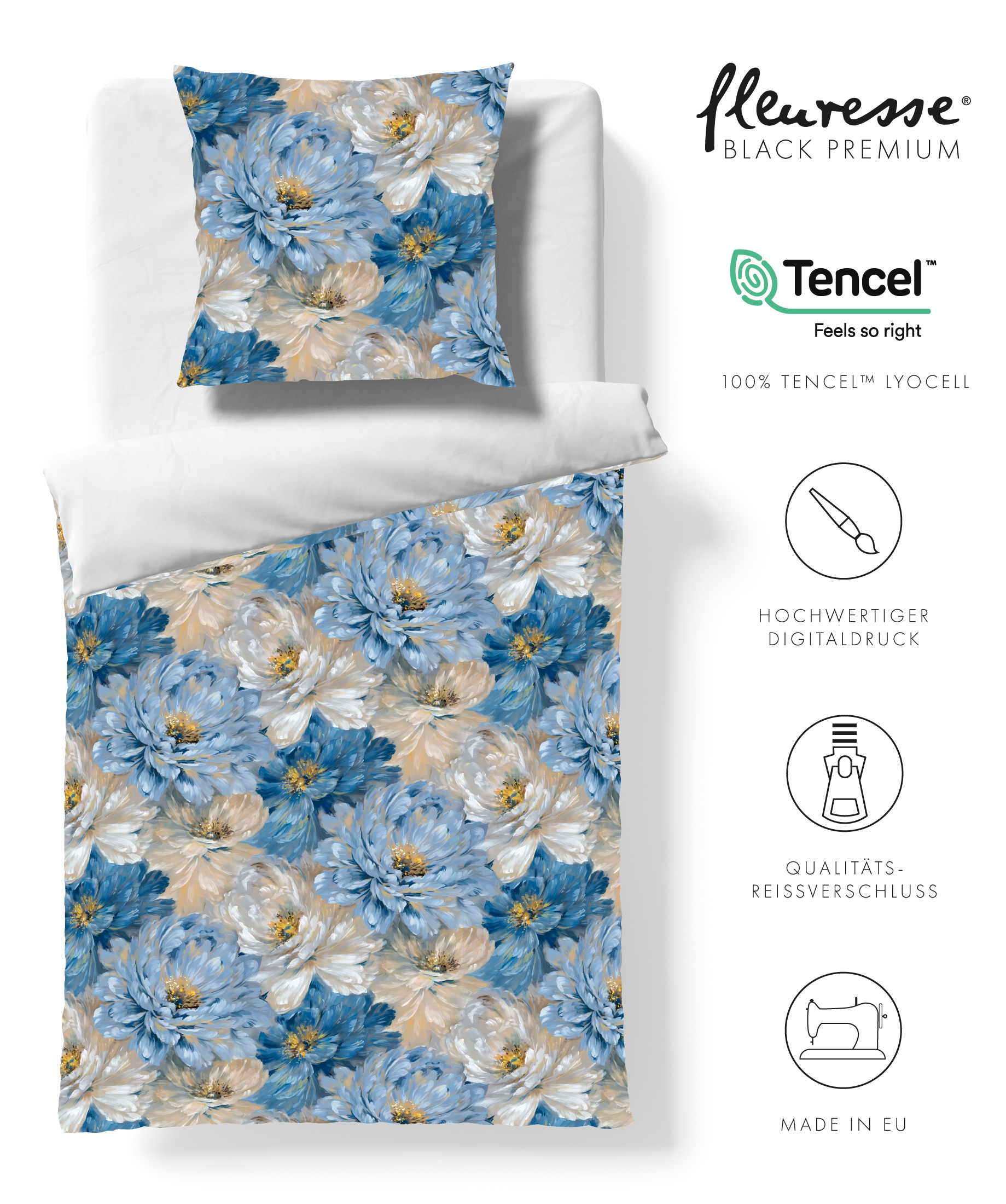 Premium Tencel Satin Bettwäsche blau floral